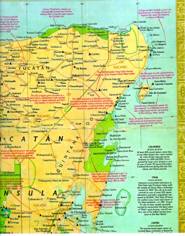 The Riviera Maya and Costa Maya are names that the East coast of the Yucatan Peninsula has recently acquired because of the rapid development of beach resorts. Geographically, the Riviera Maya stretches from Cancun southward to Tulum, along the coast of the Caribbean. Off the coast a few miles away lies the island of Cozumel. These areas are very popular for SCUBA diving and snorkeling, because of the beautiful clear waters of the Caribbean. Also the Mayan ruins and cenotes on the mainland coast are very interesting places for vacationers to visit. Costa Maya is the lower part of the coast from Placer down the coast to the small fishing village of Xcalak. Both parts of the Yucatan Peninsula are in the state of Quintana Roo, or by the abbreviation, Q. Roo. The state capital is Chetumal, but this is an inland city located on Chetumal Bay, just north of the border of Belize. The southernmost Mexican town on the Caribbean coast is Xcalak. We should consider the East coast of the Yucatan in three sections. The northern section, the Riviera Maya, from Cancun to Tulum has been under development for the past thirty years, and has become a widely know resort area. From a small village, Cancun developed into a large coastal city with hundreds of hotels, thousands of rooms, and hundreds of thousands of visitors per year. Just a few years ago, Playa del Carmen was a sleepy little village with a nice beach and the landing pier for the ferry to Cozumel. Now it has developed into a large resort area with luxurious hotels and resort type residential housing developments. A four lane freeway connects Cancun with Both Tulum to the south and Merida to the west. The center third of the Yucatan East coast has been reserved as a "Biosphere." There are two large bays, but development will be almost non existent by design, controlled by severe subdivision and building restrictions. It is good to keep this area of the coast reserved for the ecological benefit of this part of the Caribbean coast. There are two other geographical features of great importance. One is the barrier reef that runs the entire length of the Yucatan East coast from Cancun all the way to Ambergris Cay, Belize. This is the second longest barrier reef in the world, and is invaluable for protecting the beaches in most areas from erosion. It also provides a convenient area for protecting boats at anchor, making harbors unnecessary. The second is Banco Chinchorro, which is a very large reef located 18 miles offshore from Costa Maya. The reef is one of only four atolls located in the Caribbean. The significance of this reef should not be underestimated because of its size and ideal SCUBA and snorkeling conditions. The reef is larger than the island of Cozumel, being 28 miles long and 11 miles wide. The entire reef is about three to twelve feet below sea level, with three small, uninhabited points of land above water. The fact that Chinchorro offers pristine diving conditions is of great importance. Until now, the infrastructure has not existed to support diving operations on this remote reef. With the development of the dive industry along Costa Maya, we expect Banco Chinchorro to rapidly become one of the most important dive sites in the Caribbean. Development of the Costa Maya, the lower third of the coast started in 1998. Before then, you could only get to Majahual by taking Highway 307 south from Tulum for a couple of hours to an obscure turn-off eastward to the beach about fifty miles away from the main highway. After arriving at Majahual you could then turn south again for 35 miles on a beach road so bad that it took two hours to make the 35 miles to Xcalak. Once there you felt like you were in the most desolate place in the world, and this was very close to the truth. Xcalak boasted of a population of 500, but to this day, we have never been able to count more than 41 people in sight any time we drove through the quaint little village. Xcalak and Majahual are still undeveloped, but this will soon change. In 1998, a new paved road was constructed from Majahual to Xcalak parallel to the old beach road, about one mile inland. The travel time was reduced from two hours to forty minutes, and the resulting effect on the traveler's attitude is astronomical. Secondly, the little airstrip at Xcalak was increased in length and width, and a new airstrip, complete with terminal was constructed near Majahual. There is no jet capability, but it brings these areas a shuttle flight away from Cancun, Cozumel, and Merida. The third and probably the most important action was the starting of a cruise ship pier at Majahual. The pier is scheduled to receive its first cruise ship December 2000. Why a cruise ship pier? What will the tourists see and do? Well, at first, not very much except beach and jungle. The object is to have a marvelous Caribbean resort with nice hotels, restaurants, shops, and a lot of fun things to do. But what has to come first, the chicken or the egg? Even if you don't like cruise ships, you have to respect the fact that they transport a lot of people. And the people are the market for activities that will suddenly spring to life, like plants and animals in the desert that have been waiting for the first rains of the year. Within a few years, even a few months, SCUBA and snorkel shops will appear, then beach palapas offering margaritas & cervezas, then restaurants with fajitas, enchiladas, and fresh fish. More and more cruise ship tourists will return for full vacations. Then as the cruise ships double and triple their tourist cargo per year, more and more of the infrastructure will develop. Villages for workers will increase in size, developments for retirement homes, more dive shops, restaurants, hotels will appear, then grocery stores, hardware stores, markets, and other support businesses will develop. Good or bad, it has started and it will happen, and at an alarming rate. Property values will escalate as the beach property is bough